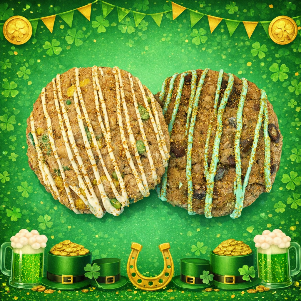 Each batch starts with a cookie dough packed with green, yellow and white chocolate chips, giving every bite a mix of creamy sweetness and bright St. Patty’s flair. Fresh out of the oven, the cookies get a finishing touch: a smooth drizzle of melted white chocolate that adds shine, texture, and just the right amount of extra indulgence.